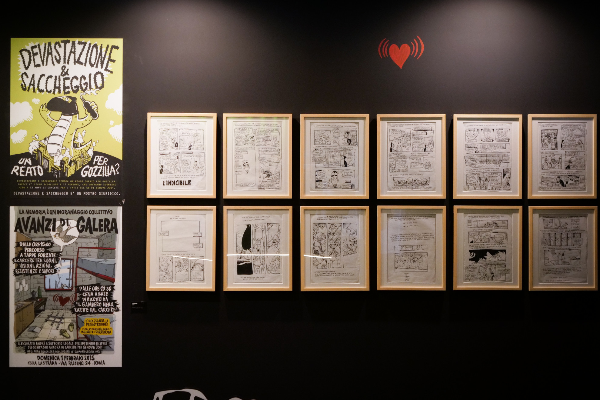 Nel 2012, in molti avevamo preso l’abitudine di svegliarci il lunedì mattina e, per prima cosa, connetterci a internet, per iniziare la settimana leggendo il nuovo episodio apparso nottetempo su zerocalcare.it. A dieci anni, una quindicina di libri, qualche serie animata e una miriade di locandine da allora, la Fabbrica del Vapore di Milano dedica fino al 23 aprile a Zerocalcare (Michele Rech) Dopo il botto, una mostra imponente che si presenta come la consacrazione di un fumettista emerso dalla scena underground dei centri sociali e oggi seguito da un pubblico vastissimo. Come si possa far convivere la militanza in gruppi di sinistra minoritari e il successo commerciale è una delle domande che accompagna il percorso espositivo – e la risposta di Rech è: cercando di mantenersi coerente con le proprie convinzioni e continuando a fare ciò che si faceva prima del "botto". Così, come sottolinea la lunga e avvincente cronologia che apre la mostra, Rech non ha mai smesso di prendere posizione, con ironia e acutezza, su ciò che gli accade intorno, che si tratti della sua vita quotidiana di giovane (ora non più giovanissimo) della periferia romana, circondato da coetanei che navigano tra precariato e incertezze, o dei fatti d’attualità (negli anni ha raccontato il G8, la resistenza curda, la pandemia). Per presentare questo percorso, alla Fabbrica Rech raccoglie, con la generosità che lo contraddistingue (sono famose le sue maratone di dediche disegnate che si protraggono per notti intere), centinaia di opere e oggetti (libri, bozzetti, tavole, locandine, magliette, pupazzetti…), proietta i suoi cartoni e allestisce una scenografia spaesante che inscena la città della quarantena. Sono lavori eterogenei ma accomunati da un segno molto riconoscibile che lo ascrive senza margine di dubbio nella "linea dello scarabocchio" (ma lui preferisce "disegnetto"): si è definito "quello che ha venduto un sacco di fumetti […] senza avere nemmeno una vaga idea di cosa fosse l’anatomia". Lo "scarabocchiare" di Zerocalcare ha però una valenza diversa rispetto a quello di Gipi in LMVDM (opera che pure ama): è sì un tratto profondamente personale che ben si presta a dare forma alla dimensione autobiografica dei suoi lavori, ma è soprattutto la scelta di campo di un punk convinto per il quale il mondo non può che essere raccontato con un segno sporco e anarchico. Dopo il botto si chiude con una frase scribacchiata sul muro: "Questa mostra esiste grazie a chi l’ha curata, montata, installata, imbullonata e a chi ha animato le esperienze collettive che io ho potuto disegnare. Fuori dalla collettività c’è solo la mitomania".