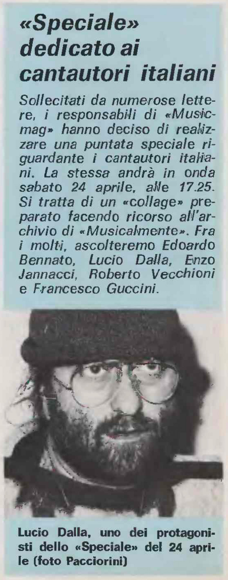 1976: Via Paolo Fabbri 43 (Guccini); Bufalo Bill (De Gregori); Elisir (Vecchioni); La torre di Babele (Bennato); Mio fratello è figlio unico (Rino Gaetano); Eppure soffia (Bertoli); Alla fiera dell’Est (Branduardi); Ho visto anche degli zingari felici (Lolli); La batteria, il contrabbasso eccetera (Battisti); Sugo (Finardi).