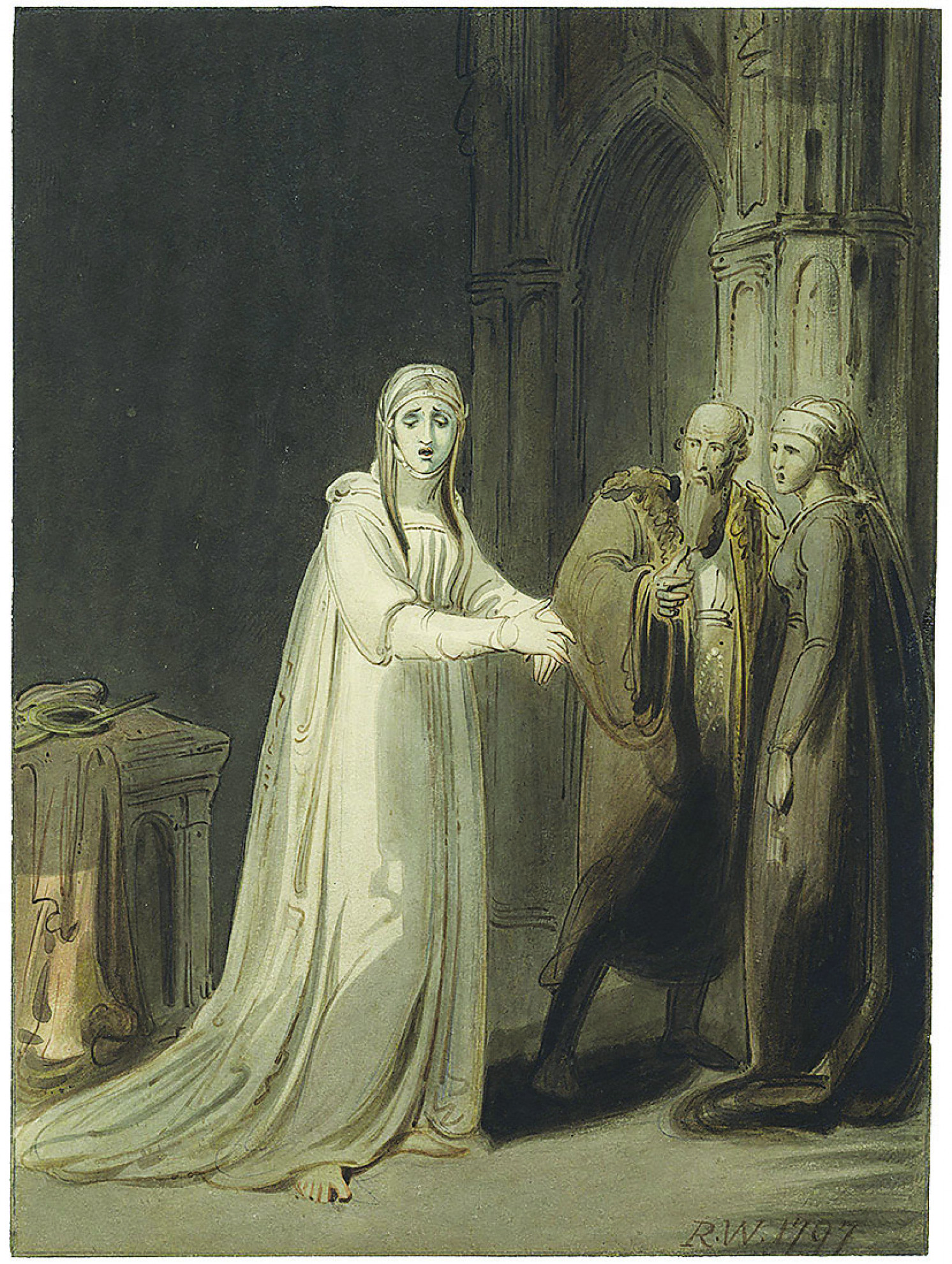 “(…) Io l’ho vista alzarsi dal letto, gettarsi addosso la sua veste da camera, aprire con la chiave il suo scrigno, trarne fuori una carta, piegarla, scrivervi, leggerla, poi suggellarla, e tornarsene a letto. E tutto ciò mentre era nel più profondo sonno. (…) Guardatela! Eccola qui che viene (...)”.